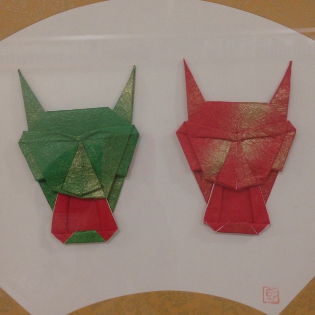 こちらの作品は、一枚の折り紙から赤鬼と青鬼の顔が作られています。